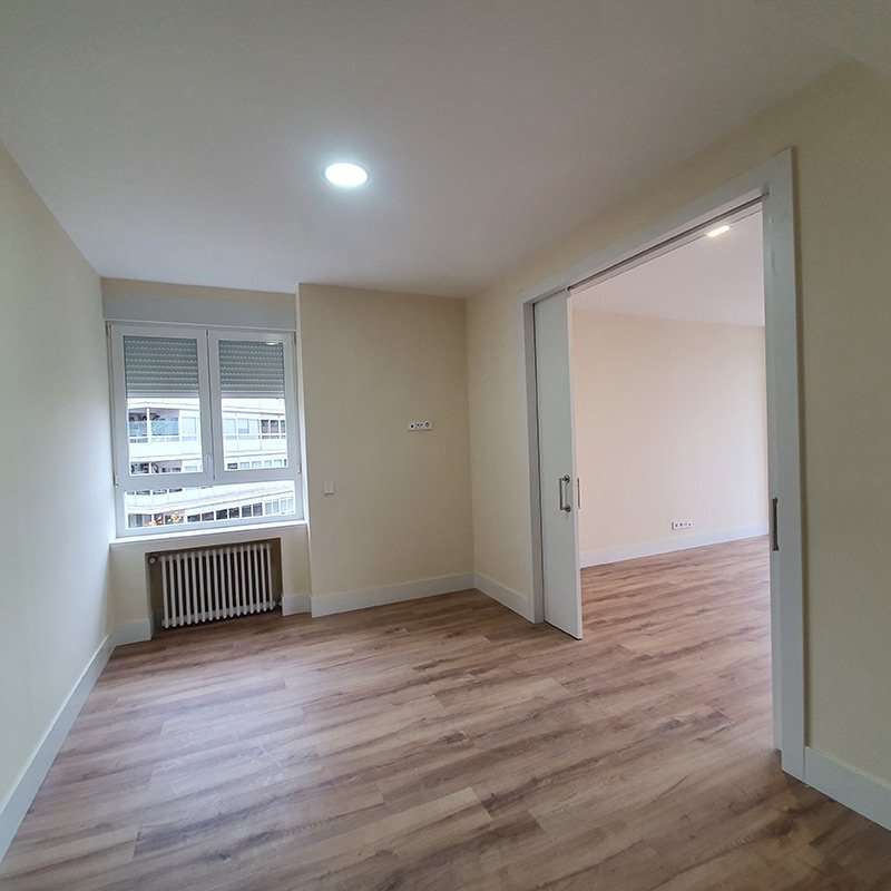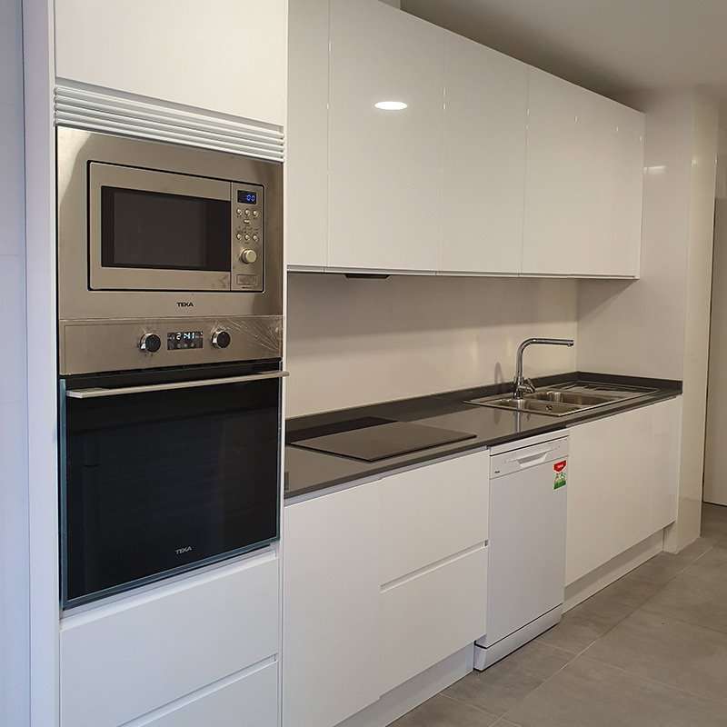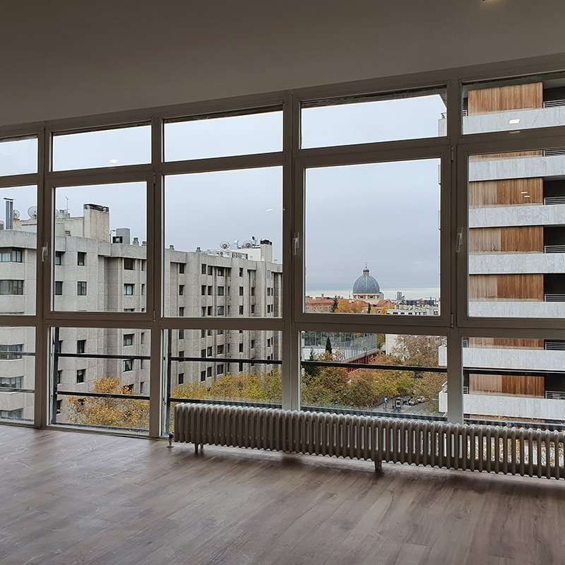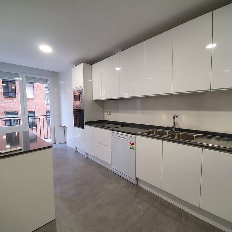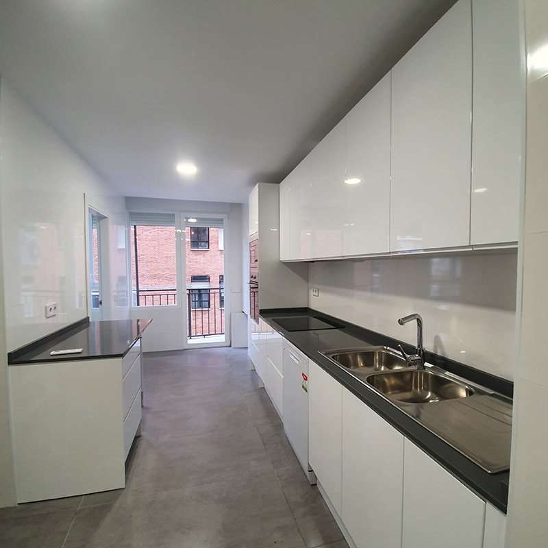 Cambio radical de un despacho de oficinas a una vivienda unifamiliar en el centro de Madrid. Con la reforma se puede ver la amplitud de la vivienda con sus grandes ventanales que dan luminosidad a la estancia. El lacado blanco de los muebles, puertas y armarios dan ese toque elegante y que hace contraste con el color de la encimera.