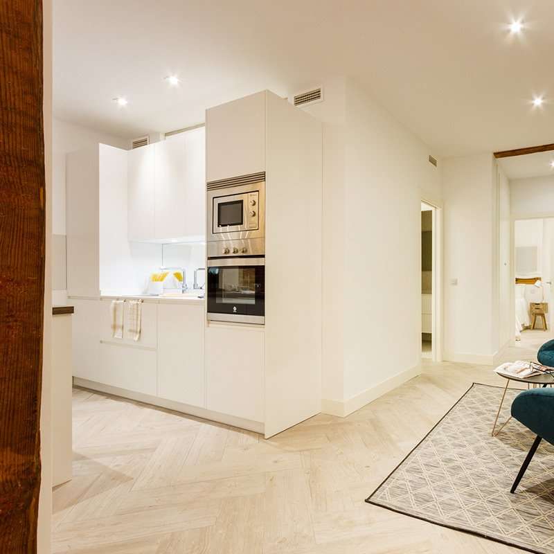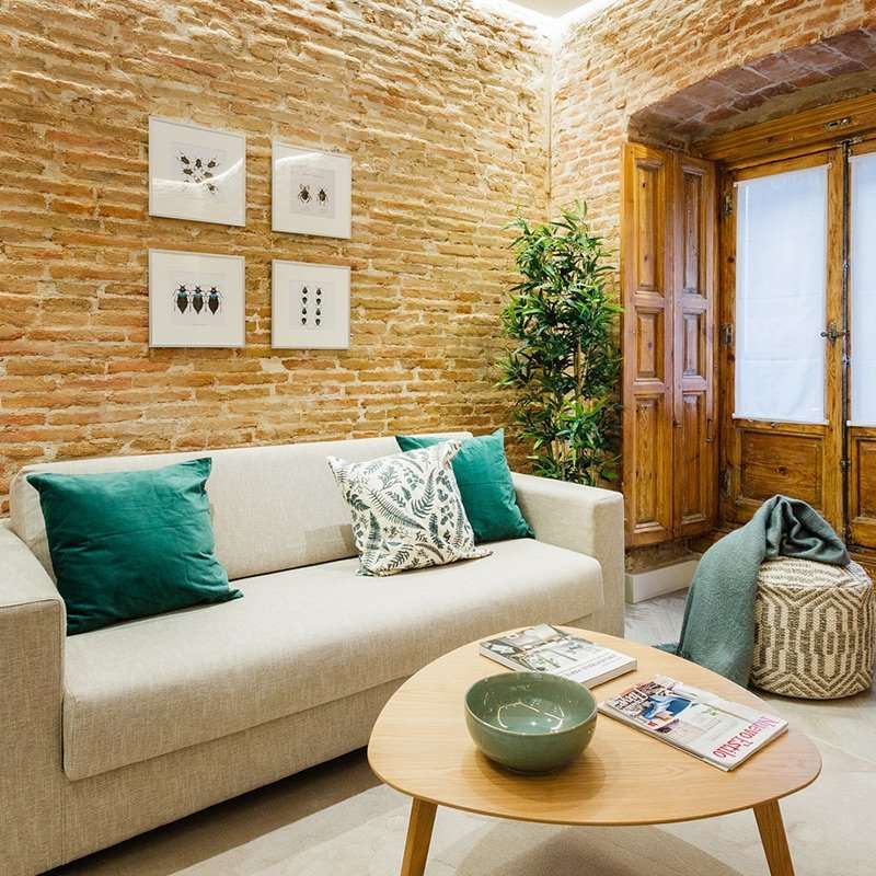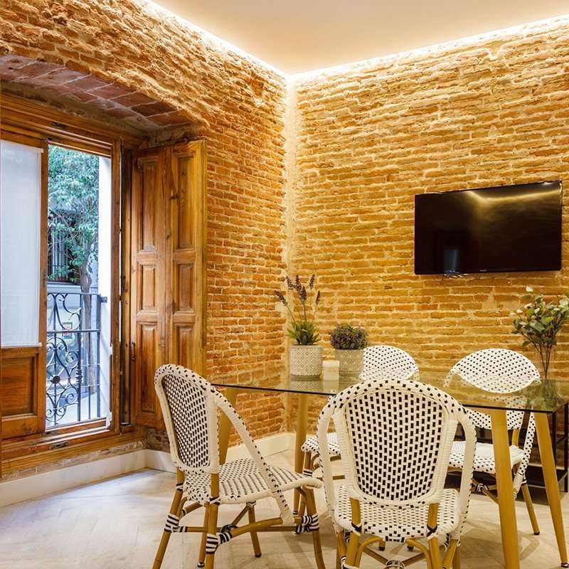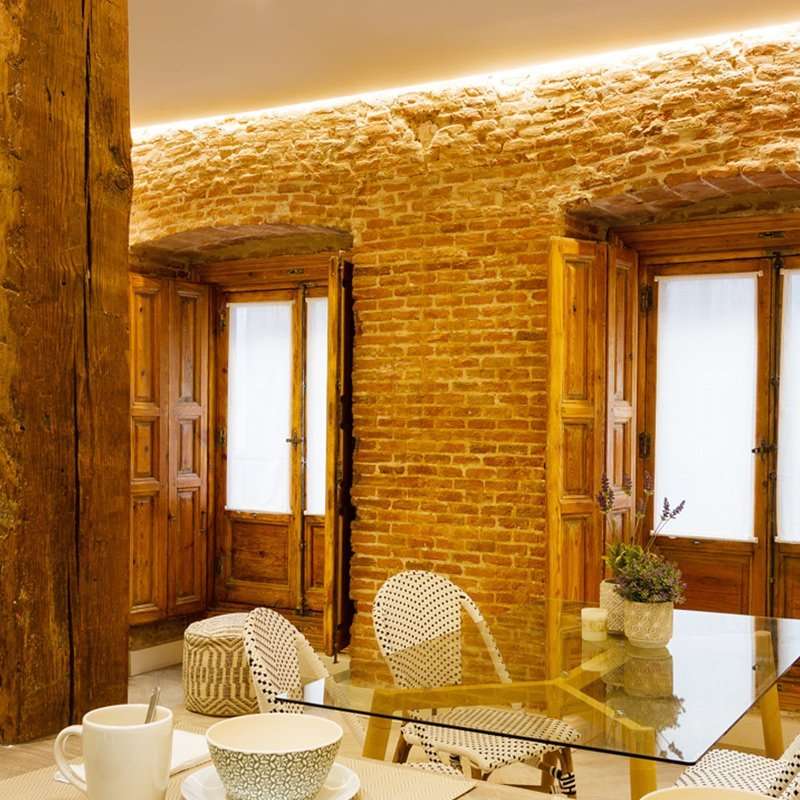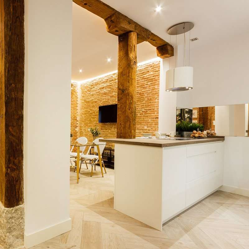 Reforma de una pequeña vivienda en el centro de Madrid. Aun siendo un pequeño espacio se consiguio sacar mucho provecho a la vivienda, ademas de conseguir un aspecto rústico y sensación de amplitud con el color blanco conjugado con el ladrillo visto y las vigas de madera.