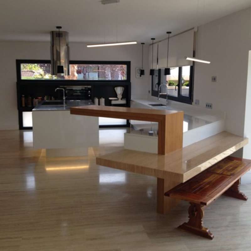 Proyecto de reforma integral y ampliación de una vivienda unifamiliar en la zona de La Moraleja, en Madrid. El chalet necesitaba un lavado de cara integro como se puede observar en el punto de partida. Iniciamos la reforma con una estructura casi apagada, descuidada, casi industrial. Como se puede observar, después de la reforma, hay una ampliación de los jardines con palmeras con una estructura más ibicenca. el color blanco de la fachada da más amplitud al conjunto de la vivienda. Destacamos la piscina y el gran espacio de la parcela como via de escape de la gran ciudad. Dentro de la vivienda podemos destacar la escalera acristalada y unos gran ventanales que le da luminosidad y un ambiente mas que agradable.